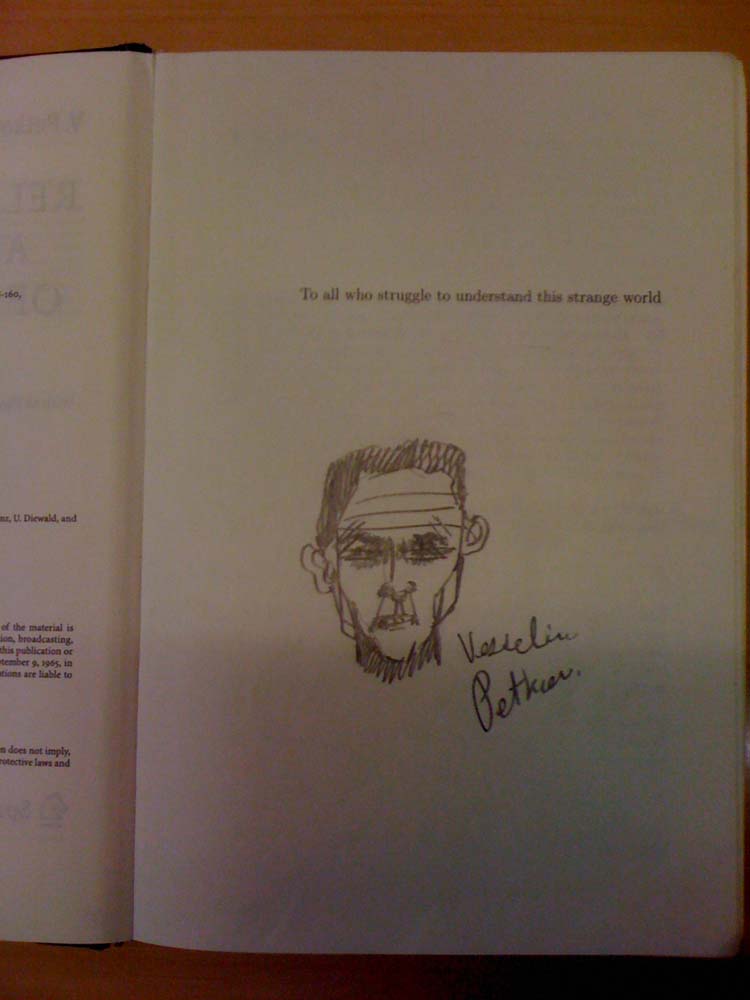 Today (Thursday, 23 September 2010) when I went in Concordia's Webster Library to arrange my book Relativity and the Nature of Spacetime to be placed on (one day) reserve I was quite perplexed (or perhaps rather amused) to see on the page with the dedication To all who struggle to understand this strange world a drawing the text of which says it was of myself. This made me wonder whether those who misunderstood relativity might be in some sense right - there are so many things in this world that look truly relative.